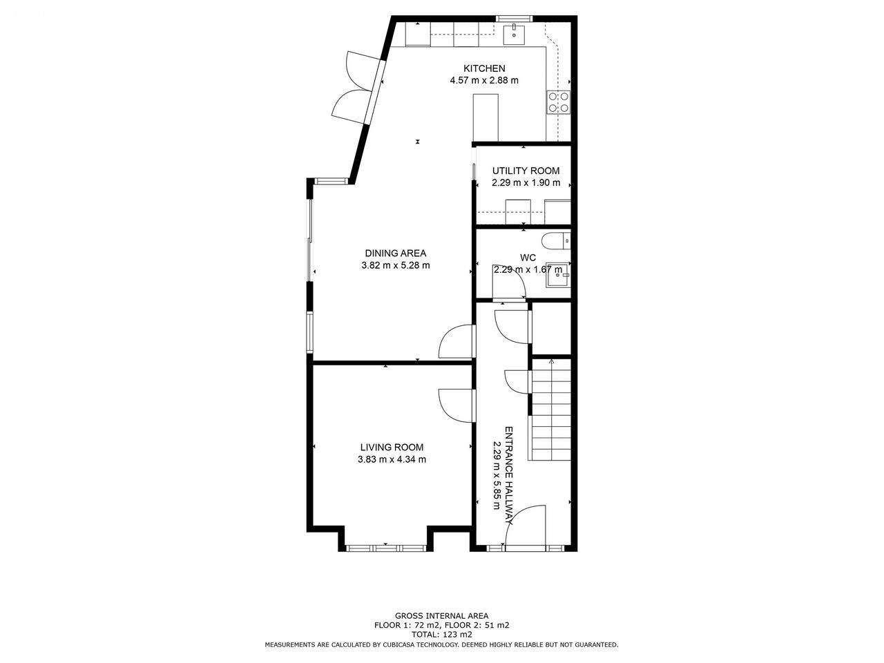 Extending to 123sqm, internally there is a wide and bright entrance hallway with storage, front living room, WC, open plan dining room and kitchen, as well a separate utility room. Upstairs are 3 large bedrooms with built in storage, one with en suite and a main bathroom all fitted out to the highest quality. Underfloor heating on the ground floor combined with the double glazed windows ensures this is an energy efficient home to run. Two double glass doors provide direct access from the kitchen to the rear garden which has artificial grass laid for low maintenance. Not overlooked by any neighbouring properties this is a light filled tranquil space.
