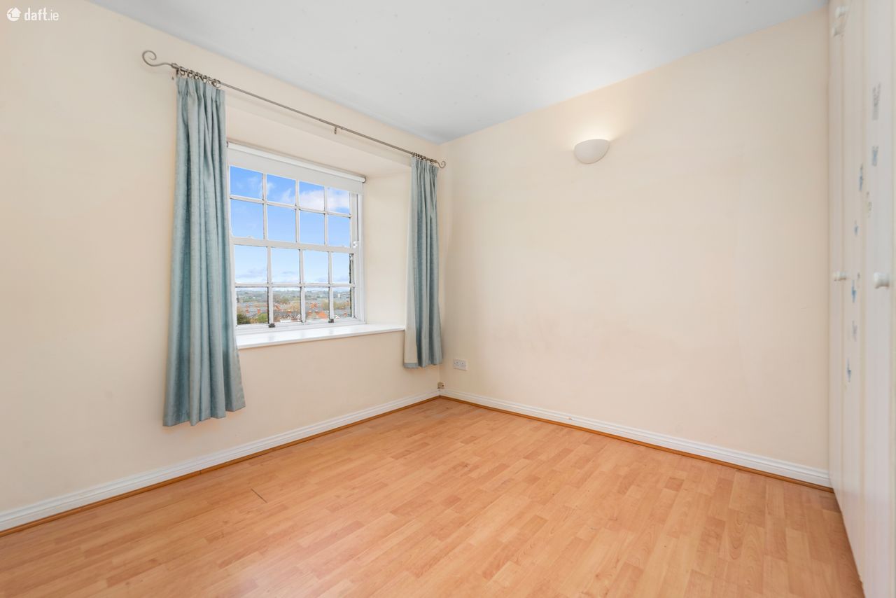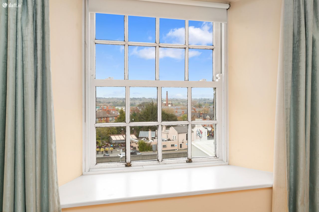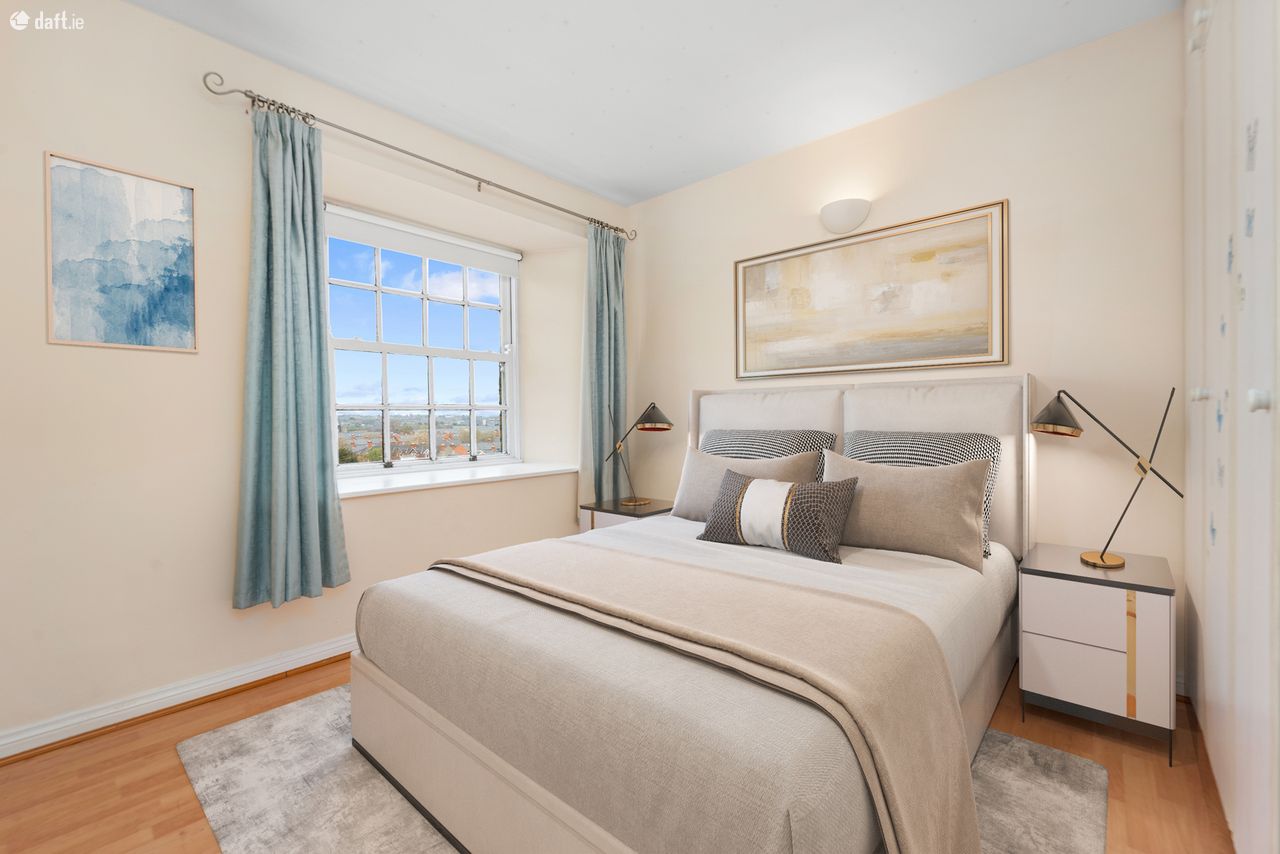 Bedroom 3.22m x 2.95 – Spacious double bedroom with built-in storage, high ceilings and laminate flooring. Views over North County Dublin. Sash window.