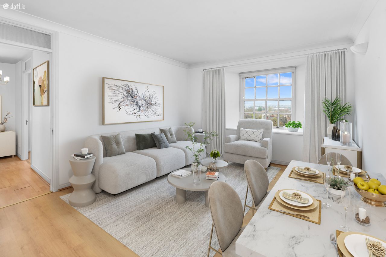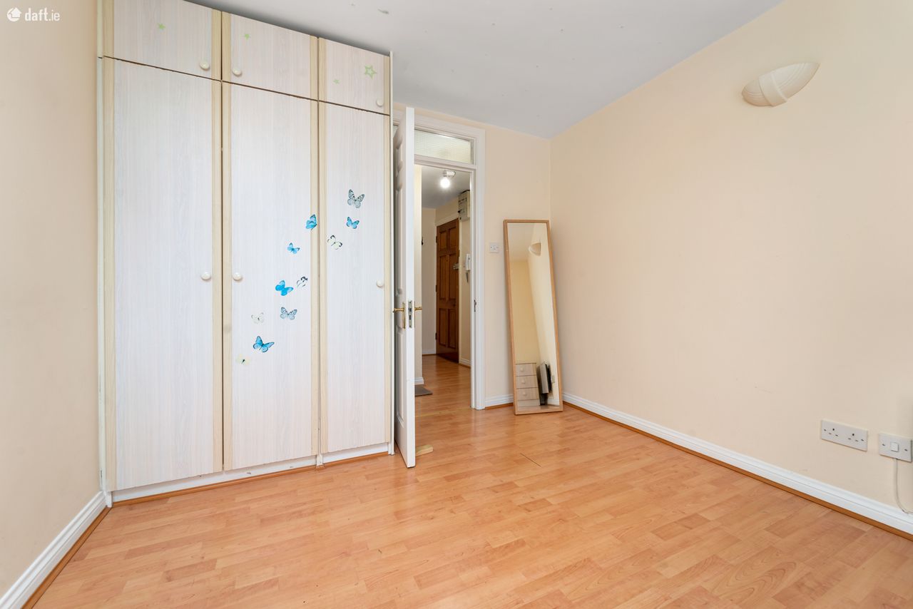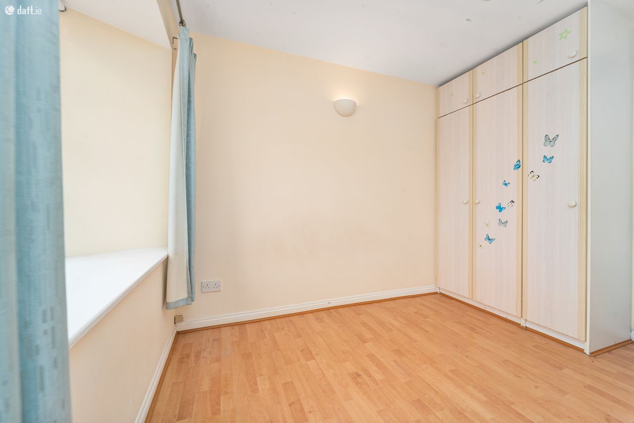 Bedroom 3.22m x 2.95 – Spacious double bedroom with built-in storage, high ceilings and laminate flooring. Views over North County Dublin. Sash window.